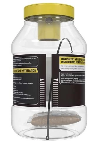Draai de dop van de val en haal de tiewrap eruit. Laat de lokstof in het wateroplosbare zakje zitten. Vul de vliegenval tot aan de maatstreep van het etiket met lauw water. Draai de deksel op de val en schud voorzichtig zodat de lokstof oplost. Trek de bovenkant van de dop omhoog. Plaats de vliegenval buiten. Bij voorkeur op een zonnige warme plek, op ongeveer 5 meter afstand van menselijke activiteiten. Gebruik de tiewrap om de val ergens aan te bevestigen.
