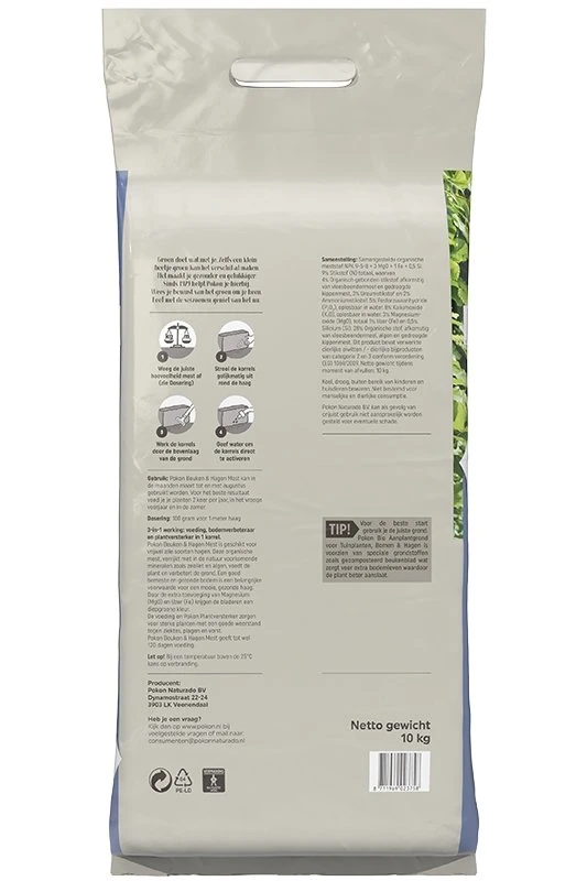 3-in-1 werking: voeding, bodemverbeteraar en plantversterker in 1 korrel. Pokon Beuken & Hagen Mest is geschikt voor vrijwel alle soorten hagen. Deze organische mest, verrijkt met in de natuur voorkomende mineralen zoals zeoliet en algen, voedt de plant en verbetert de grond. Een goed bemeste en gezonde bodem is een belangrijke voorwaarde voor mooie, gezonde haag. Door de extra toevoeging van Magnesium (Mg0) en IJzer (Fe) krijgen de bladeren een diepgroene kleur. De voeding en Pokon Plantenversterker zorgen voor sterke planten met een goede weerstand tegen ziektes, plagen en vorst. Pokon Beuken & Hagen Mest geeft tot wel 120 dagen voeding. Pokon Beuken & Hagen Mest kan in de maanden maart t/m augustus gebruikt worden. Voor het beste resultaat voed je je planten 2 keer per jaar, in het vroege voorjaar en in de zomer.