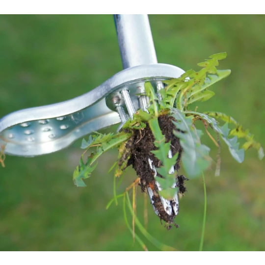 Plaats de onkruidsteker simpelweg verticaal over het onkruid, druk de zwarte knop naar beneden in de grond. Duw met je voet het opstapje totdat deze nog boven de grond te zien is. Trek de zwarte knop weer omhoog. Meer hoef je niet te doen: het onkruid is nu met wortel en al verwijderd.